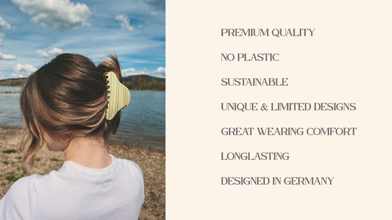 Unsere Designs sind schonend für Deine Haare und die Umwelt. Selbst die kleinen alltäglichen Dinge haben Auswirkungen auf unseren Planeten. Lass uns das gemeinsam ändern und unsere Haare nachhaltig stylen.